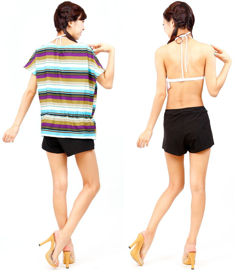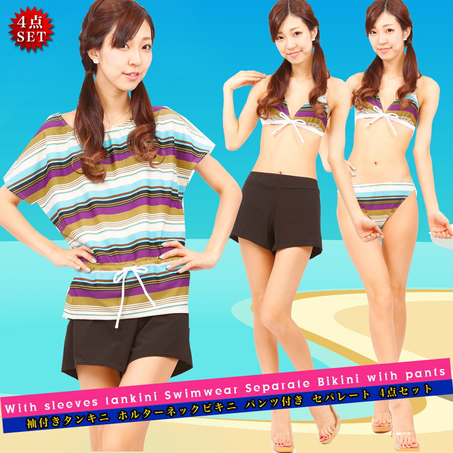 【新作】国内ブランド タンキニ水着 セパレート パンツセットの4点セット ●ホルターネックビキニとスモックデザイン風の袖付き(半袖)タンキニ +ビキニパンツ+カバーパンツ ●お得な4点セットのレディース水着となります。