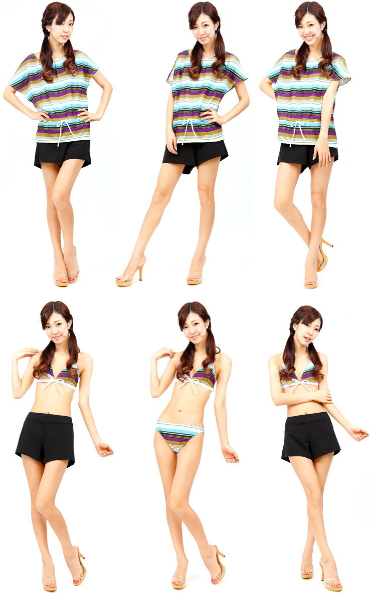 ●ビキニにはパッド&パットポケット付きで綺麗なバストラインとバストアップ効果! ●カラフルなボーダー柄で女の子らしく可愛い水着です。
